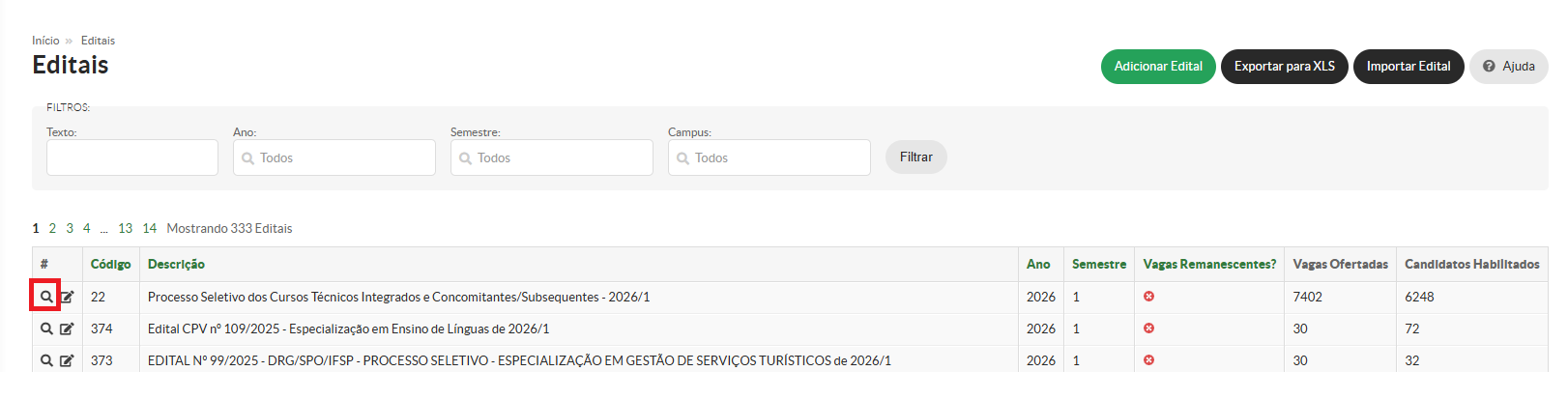 2 - Localize o edital responsável pelo atendimento dos pedidos de matrícula e clique no ícone da lupa, disponível na mesma linha do edital.