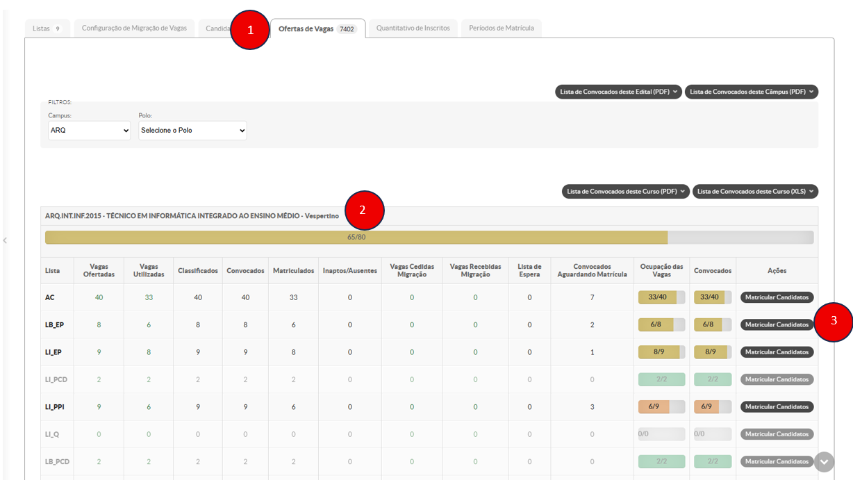 3 - Clique na aba "Ofertas de Vagas", localize os respectivos cursos que os candidatos foram convocados e as respectivas listas de convocação e clique em "Matricular Candidato".
