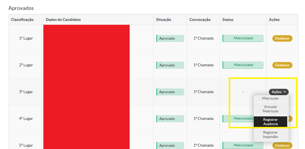 4 - Localize os candidatos, na mesma linha de cada candidato, clique no botão "Ações" e depois "Registrar Ausência"
