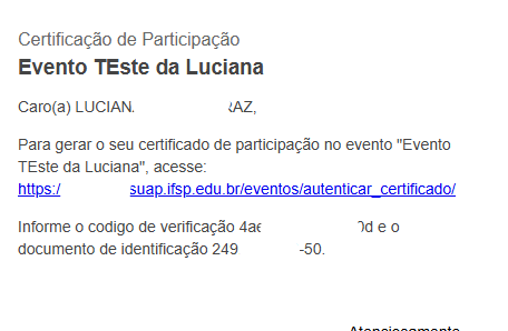 Após a confirmação da presença de participantes em um evento, os certificados de participação são enviados por e-mail para cada participante, permitindo que os participantes possam acessar a área extrena do SUAP e emitir seus certificados.