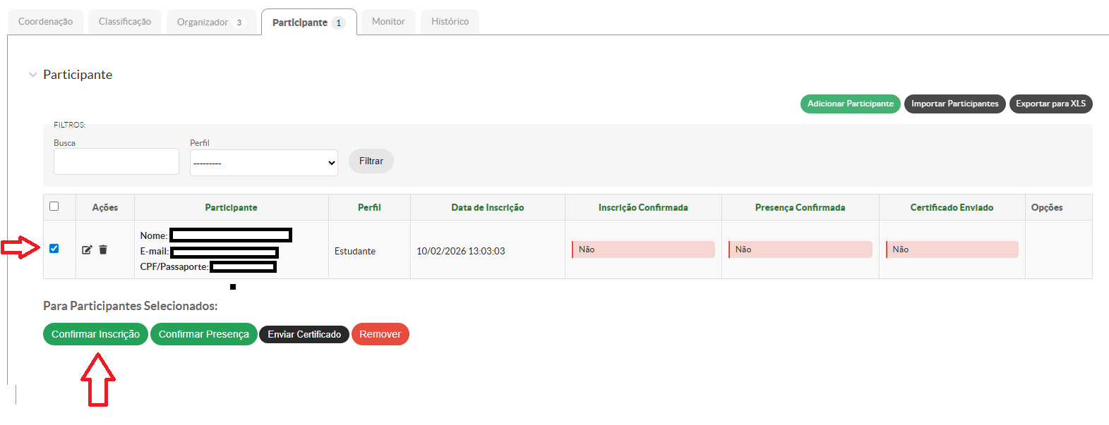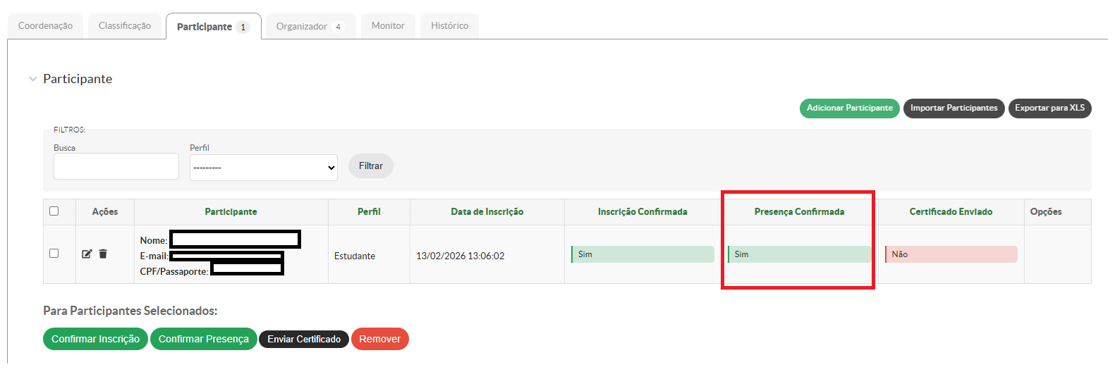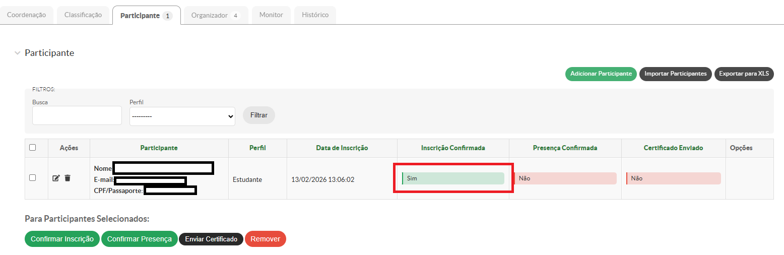 Após realizar a inserção de todos os participantes com suas respectivas participações para o evento, é necessário que sejam confirmadas as inscrições, confirmadas as presenças e enviados os certificados.
