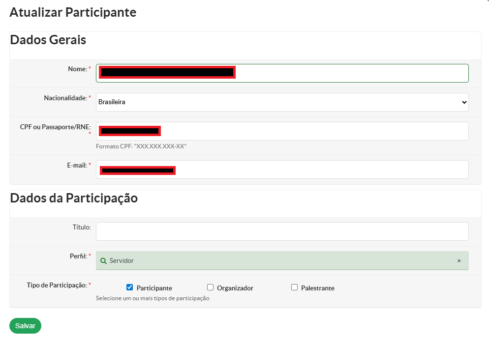 Caso haja alguma informação incorreta para os participantes, estas podem ser editadas clicando no ícone "Editar" ao lado do nome do participante. Abrirá uma nova janela com as informações inseridas que poderão ser editadas. Após as correções basta clicar no botão "Salvar".
