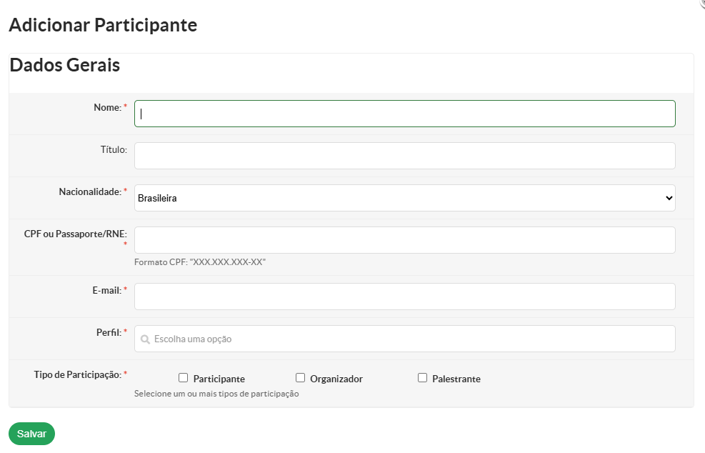Ao clicar em "Adicionar Participante" abrirá uma janela para inserir as informações.