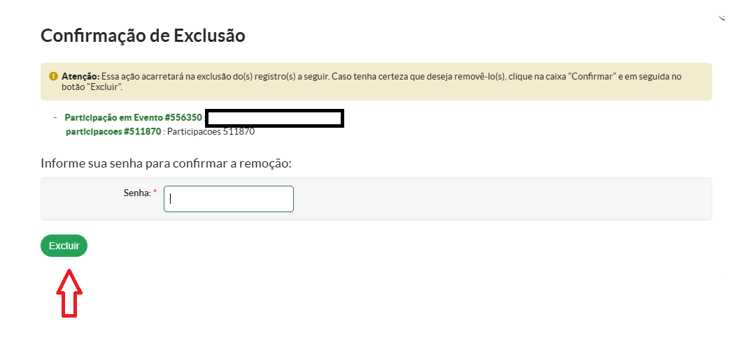 Usuário deverá preencher a senha e clicar em "Excluir". O participante será removido do evento.