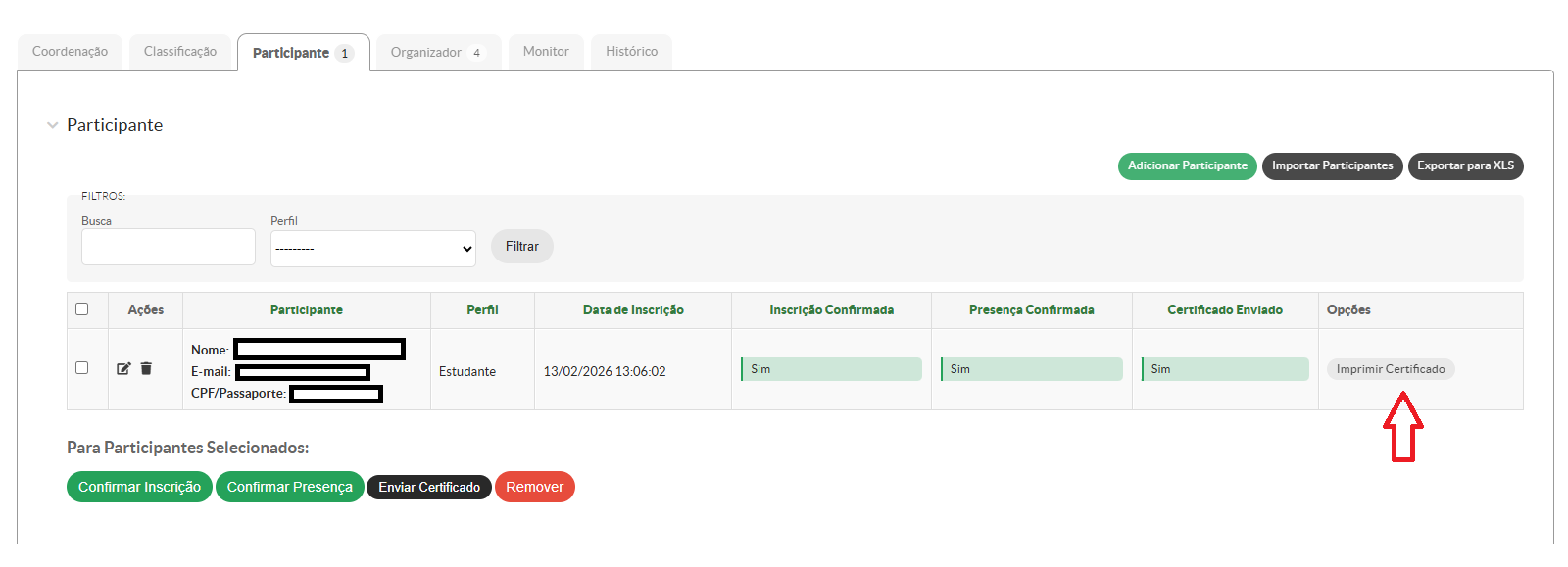 Caso o coordenador ou organizador do evento desejar baixar os certificados gerados para os participantes, poderá clicar sobre o botão "Imprimir Certificado" para o participante desejado, e o mesmo iniciará o download para posterior apresentação.
