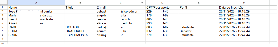 Após selecionar a opção, uma planilha será salva no computador do usuário com os dados das pessoas com o tipo de participação selecionada, conforme a seguir:
