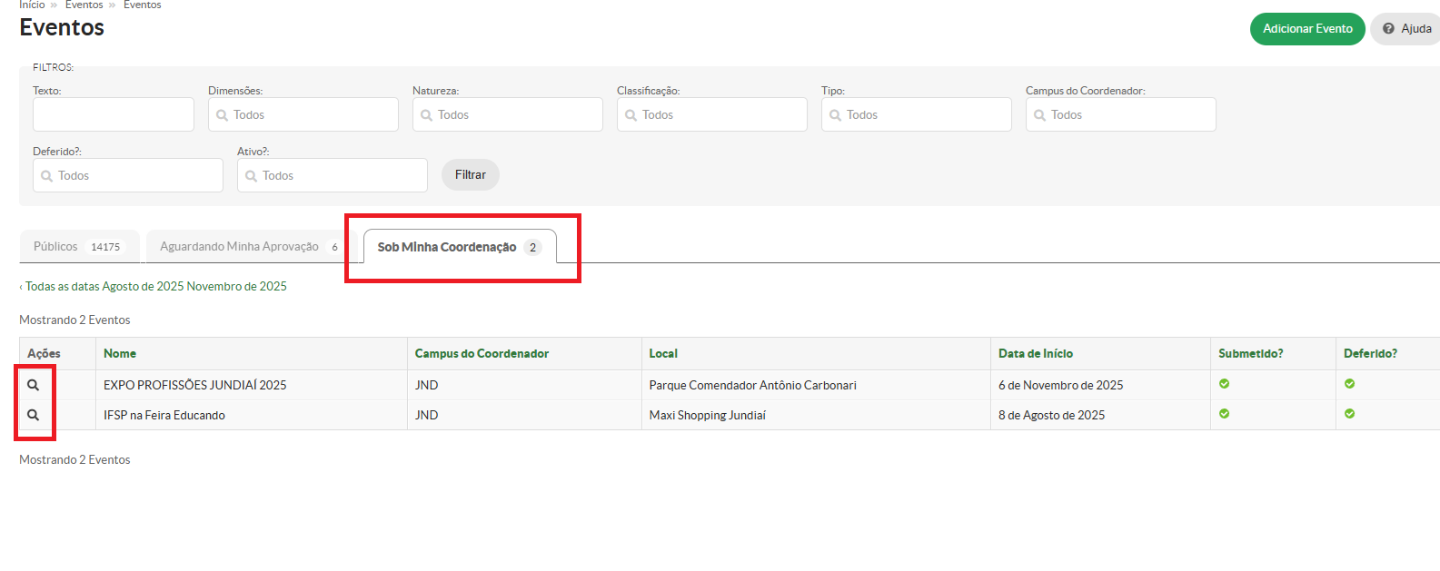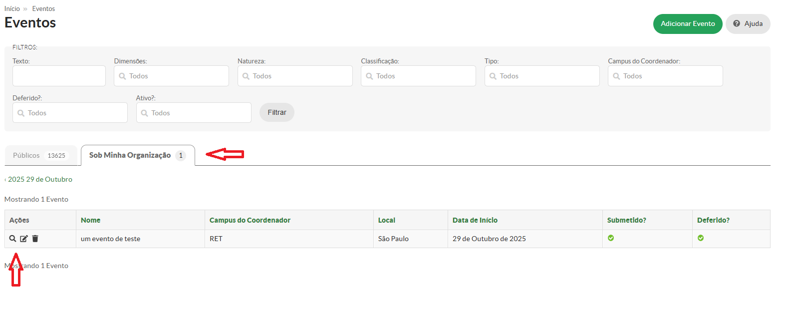 Como organizador, acessar a aba "Eventos sobre minha organização" e clicar sobre no ícone de lupa do evento desejado: