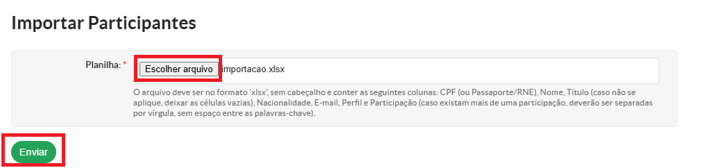 OBS: É possível adicionar uma mesma pessoa em mais de um tipo de participação. Neste caso, para realizar esta operação via planilha do excel, o usuário deverá adicionar todas as participações desejada para uma determinada pessoa separados por virgula e sem espaços em branco na mesma coluna.