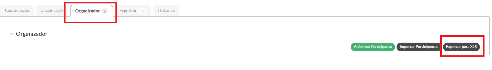 Obs: No caso da exportação, as pessoas adcionadas a planilha criada serão apenas as que se encontram na respectiva aba acessada, no exemplo anterior. Apenas pessoas cadastradas no tipo de participação "Organizador"