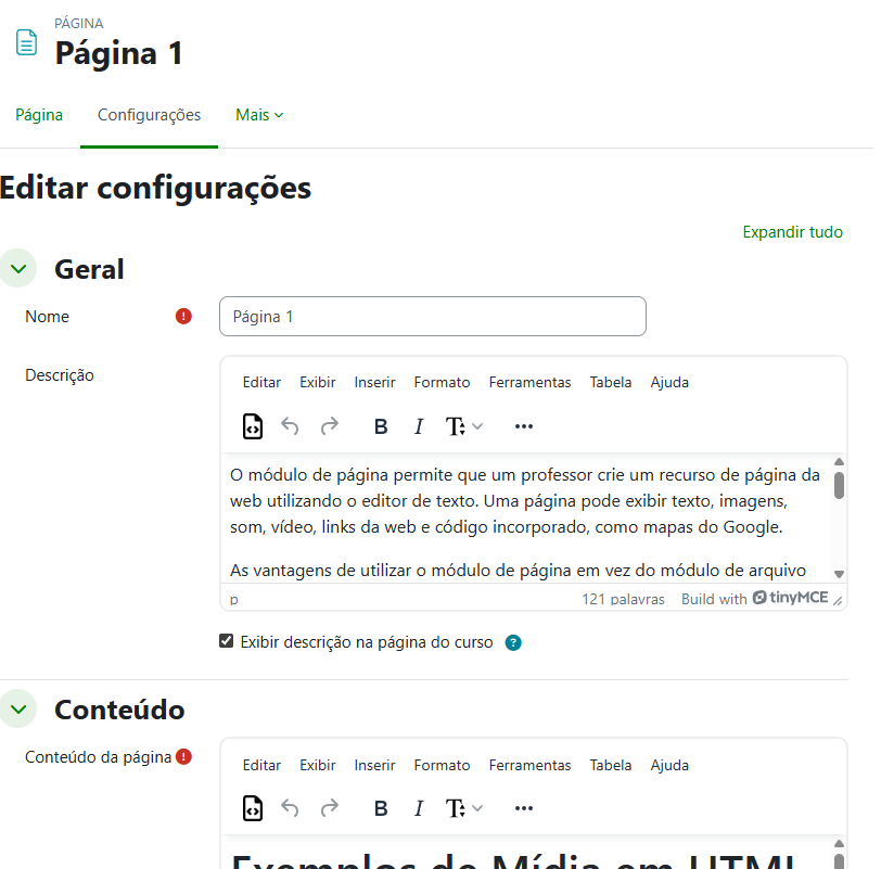 O módulo de página permite que um professor crie um recurso de página da web utilizando o editor de texto. Uma página pode exibir texto, imagens, som, vídeo, links da web e código incorporado, como mapas do Google. Para bem utilizar este recurso, recomenda-se o conhecimento básico da linguagem HTML.