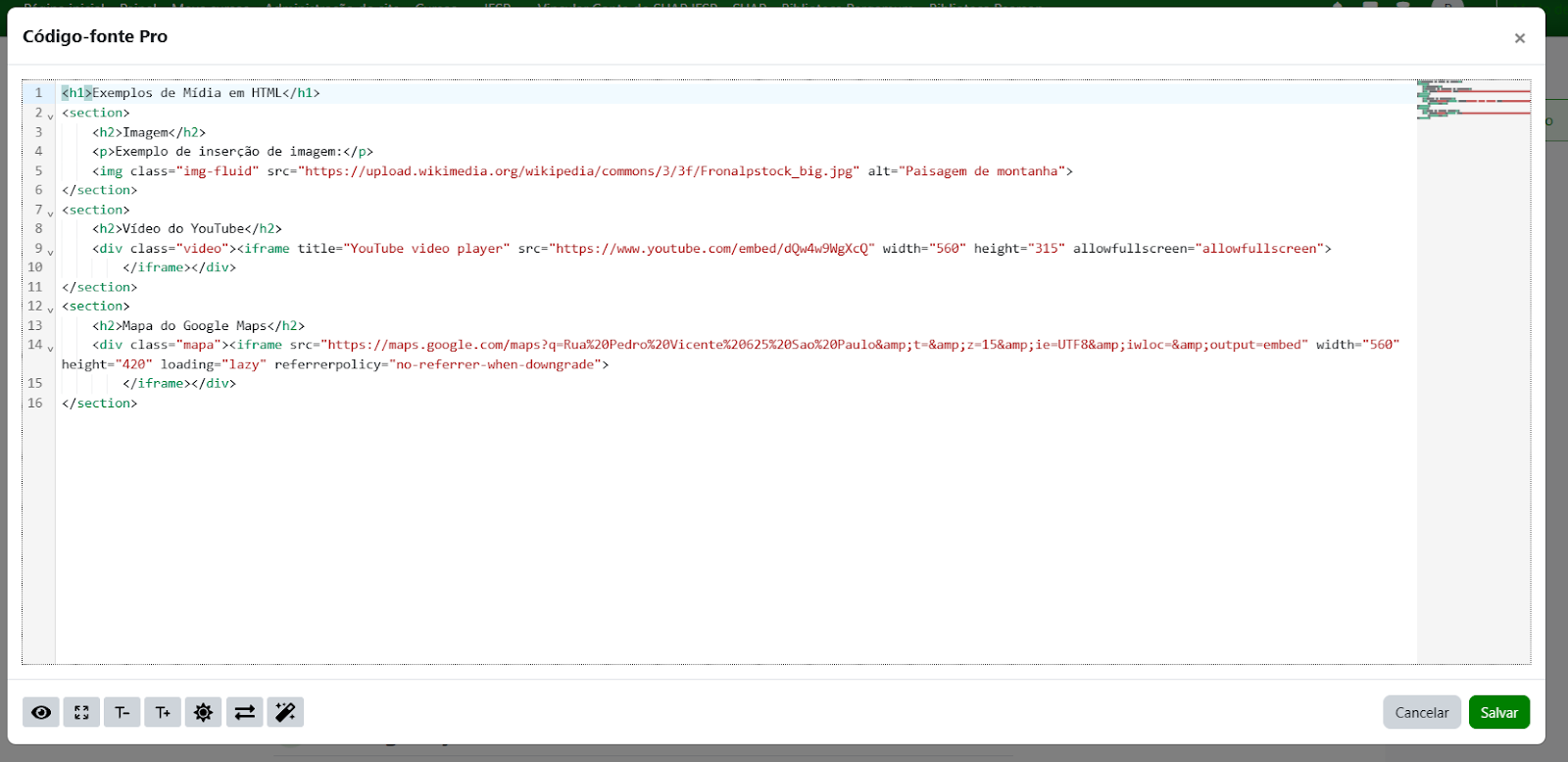 Na seção logo abaixo, “Conteúdo”, é onde você adicionará propriamente o código HTML de sua página. Clique no ícone assinalado na Figura 18: