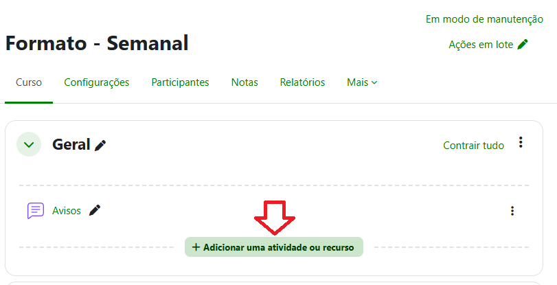 6. Para inserir Atividades ou Recursos, o modo de edição também precisa estar habilitado. Caso não o esteja repita a orientação do passo 1;