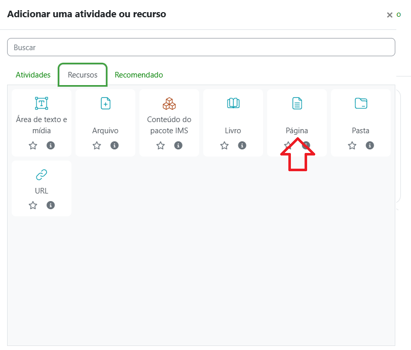 As vantagens de utilizar o módulo de página em vez do módulo de arquivo incluem o fato da página ser mais acessível (por exemplo, para usuários de dispositivos móveis) e mais fácil de atualizar o conteúdo. Após clicar em “Adicionar uma atividade ou recurso” e na aba “Recursos”, selecione “Página”.