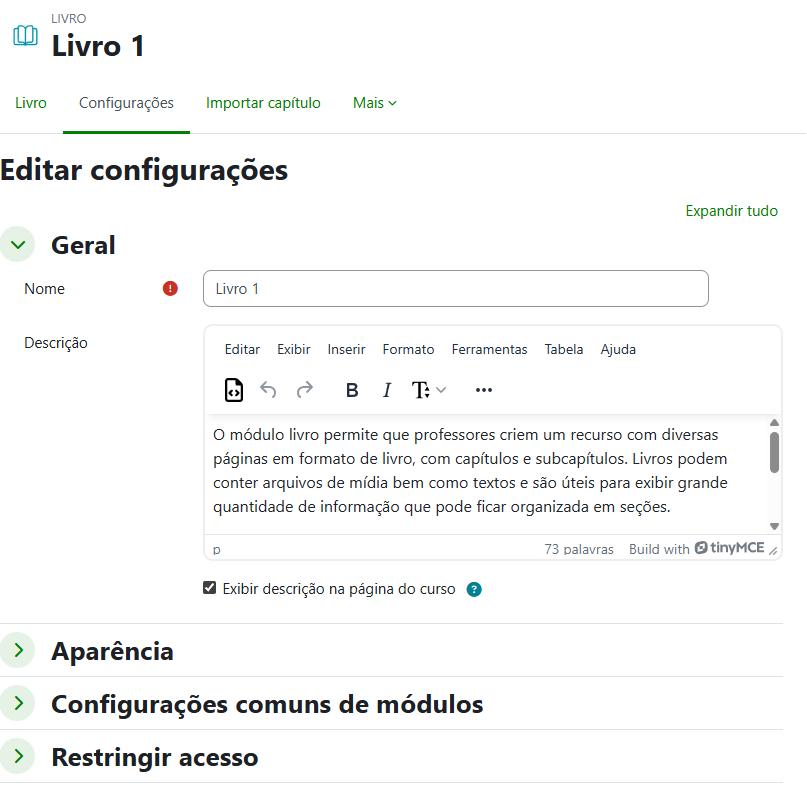 Você será redirecionado à página de configurações do livro (Figura 13) e deverá preencher com um nome. Opcionalmente, poderá adicionar também uma descrição.