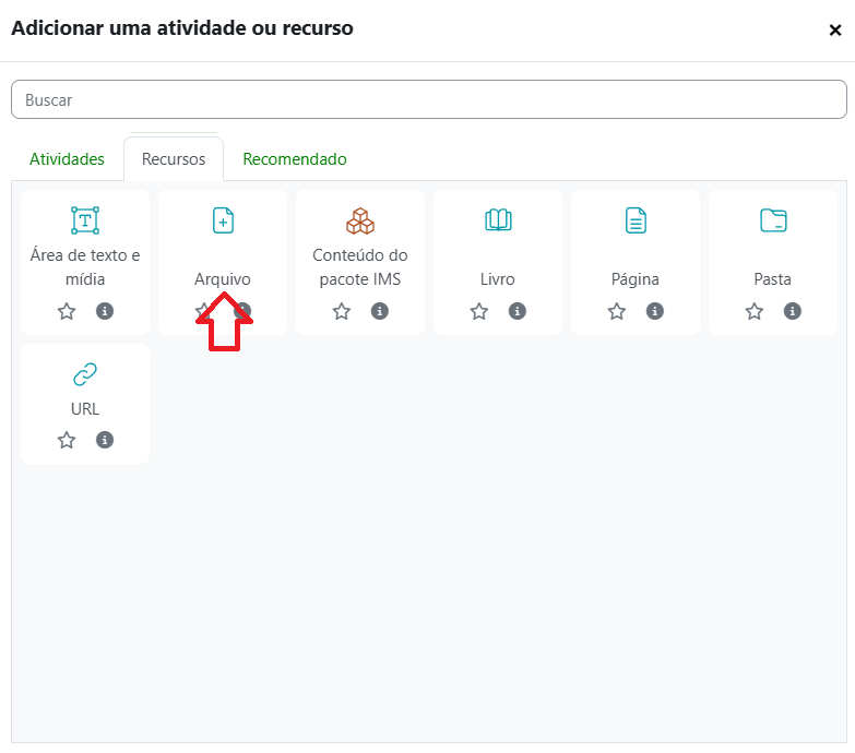 O recurso “Arquivo” permite que você faça o upload de um arquivo (de texto, de imagem etc.) que está em seu computador para a seção desejada em sua disciplina. Após clicar em “Adicionar uma atividade ou recurso”, clique na aba “Recursos” e depois em “Arquivo”, conforme Figura 9: