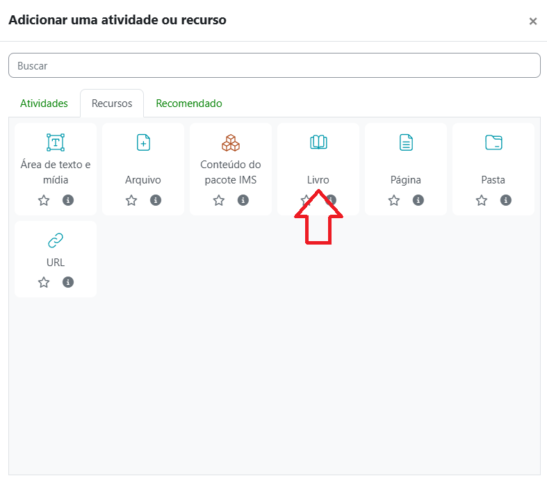 O módulo livro permite que professores criem um recurso com diversas páginas em formato de livro, com capítulos e subcapítulos. Livros podem conter arquivos de mídia bem como textos e são úteis para exibir grande quantidade de informação que pode ficar organizada em seções. Você pode encontrá-lo na aba “Recursos”, após clicar em “Adicionar uma atividade ou recurso” (conforme Figura 12):