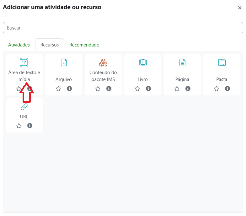 Trata-se do recurso mais comumente utilizado. Tem por finalidade inserir um bloco de texto em uma seção do curso (também possibilita a inserção de imagens e outros recursos embutidos). Após clicar em “Adicionar uma atividade ou recurso” (conforme item 2), você pode usar o campo de busca para localizá-lo ou clicar na aba “Recursos” e então “Área de texto e mídia”, conforme Figura 7: