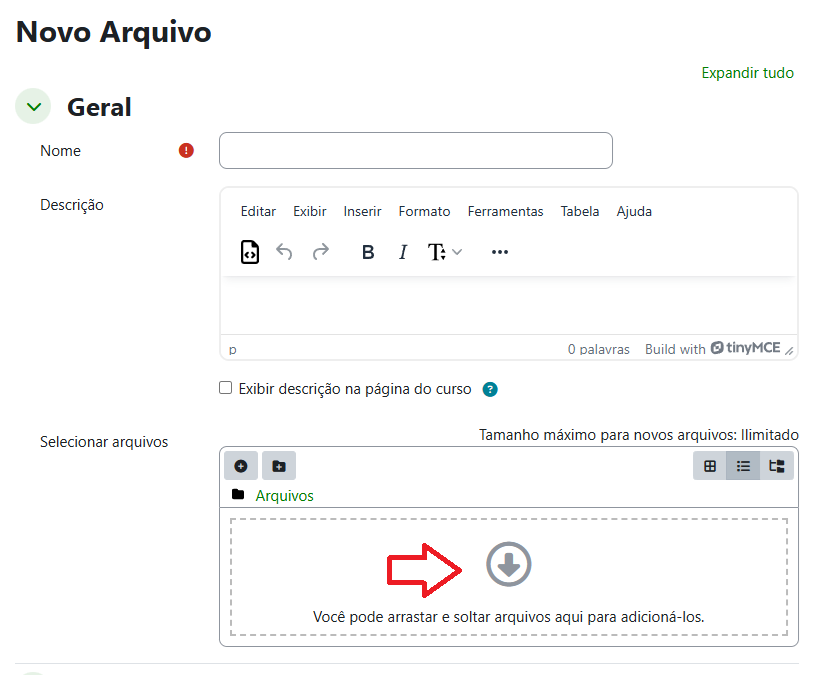 Você deverá então fornecer um nome de exibição para o seu arquivo, preenchendo o campo “Nome”. O campo “Descrição” é opcional. Após, no campo “Selecionar arquivos”, você tem duas opções: