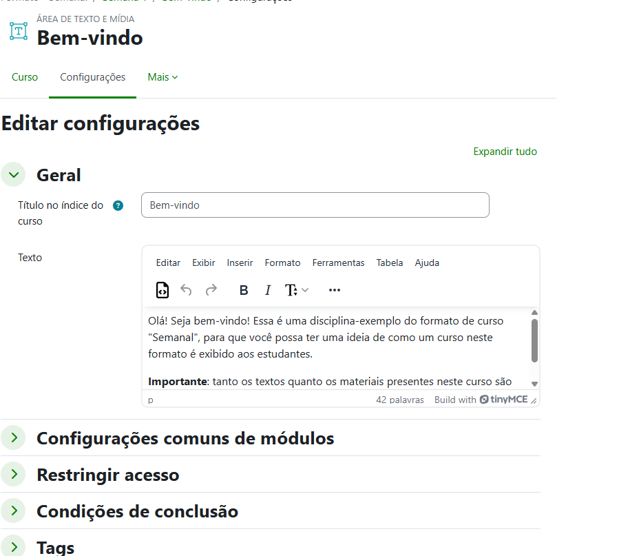 Uma aba de “Configurações” será aberta, conforme Figura 8. Você deve fornecer um título e preencher com o conteúdo desejado no campo “Texto”. Atenção: o editor de texto poderá estar um pouco diferente da imagem. A troca do editor de texto será tratada em outro tutorial.