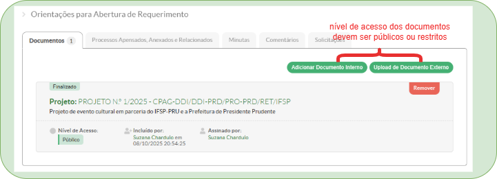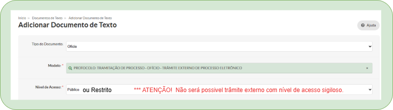 A mesma recomendação acima serve para inserir documentos ao processo, pois só poderão ser tramitados externamente os processos com documentos públicos ou restrito.