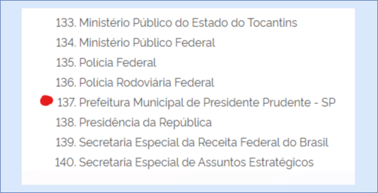 Ao consultar a lista, que está em ordem alfabética, foi possível localizar a Prefeitura de Presidente Prudente, que utiliza o SEI como sistema de processo eletrônico.