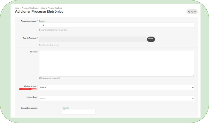 Ao abrir o processo eletrônico para tramitação externa de documento avulso ou diversos documentos, selecionar o nível de acesso público ou restrito, pois não será possível a tramitação externa de documento sigiloso.
