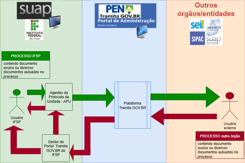 - o usuário, que corresponde ao servidor lotado em setores do IFSP que necessita tramitar processo eletrônico ou documento avulso (autuado no processo) do SUAP para outro órgão/entidade;
