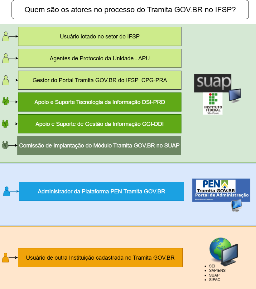 - o usuário, que corresponde ao servidore lotado em setore do IFSP que necessita tramitar processo eletrônico do SUAP para outro órgão/entidade;