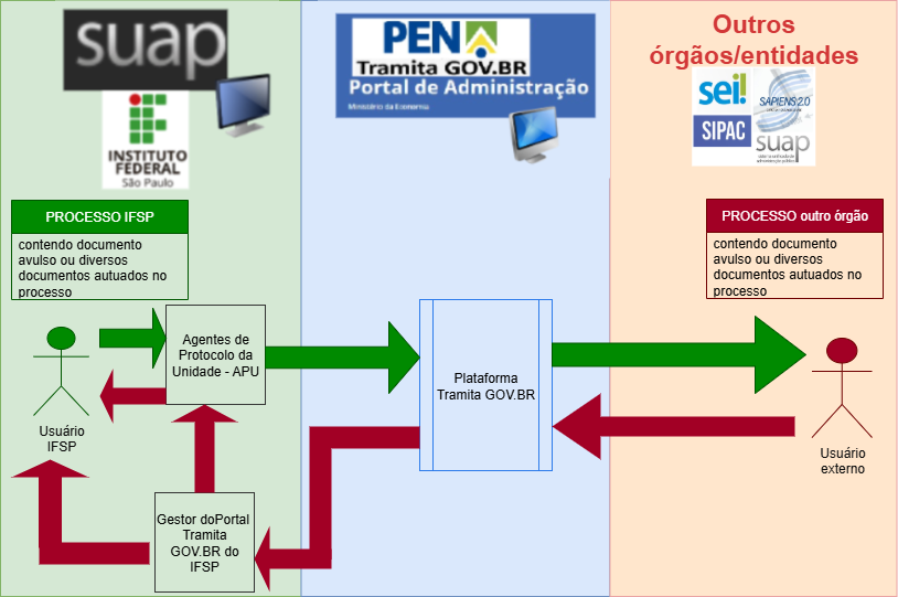 O diagrama a seguir representa o fluxo geral do caminho do trâmite externo, tanto para encaminhar como para receber processos eletrônicos. Desta maneira, um processo criado no SUAP IFSP poderá ser encaminhado à outro órgão/entidade habilitado no Portal Tramita GOV.BR gerenciado pelo Ministério da Gestão e da Inovação em Serviços Públicos - MGI, assim como podemos receber processo eletrônico de outro órgão/entidade.